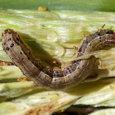 These greenish grey larvae/caterpillars have black spots along the body and are about 3cm long The damage they cause is similar to armyworm and cutworm and they are often found operating at the same time.